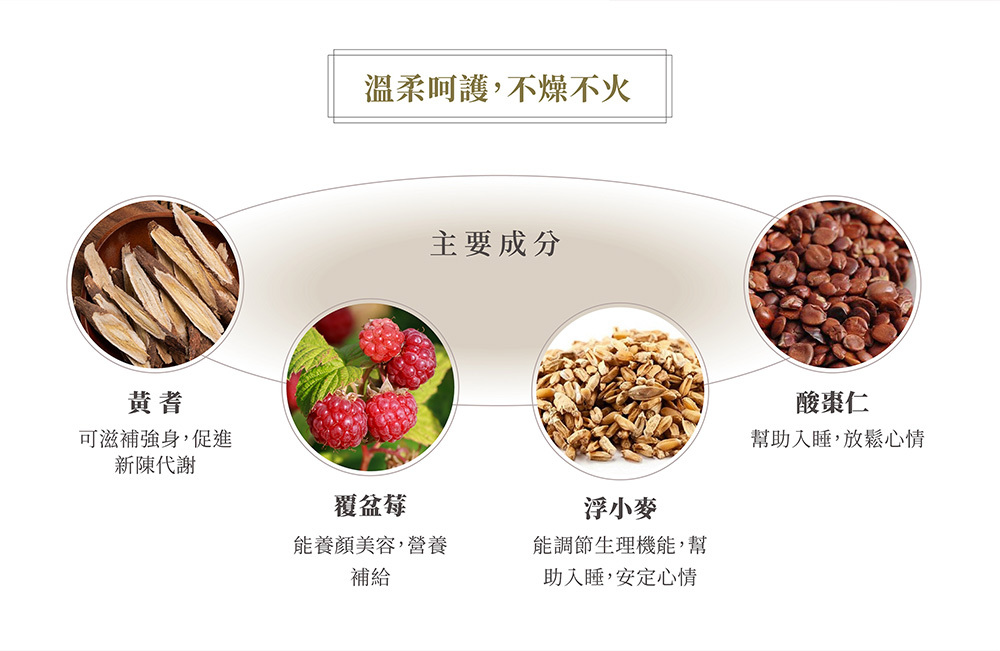 -蘊含寧心安神成份〈覆盆莓、丹參、浮小麥、酸棗仁〉,平穩身心靈